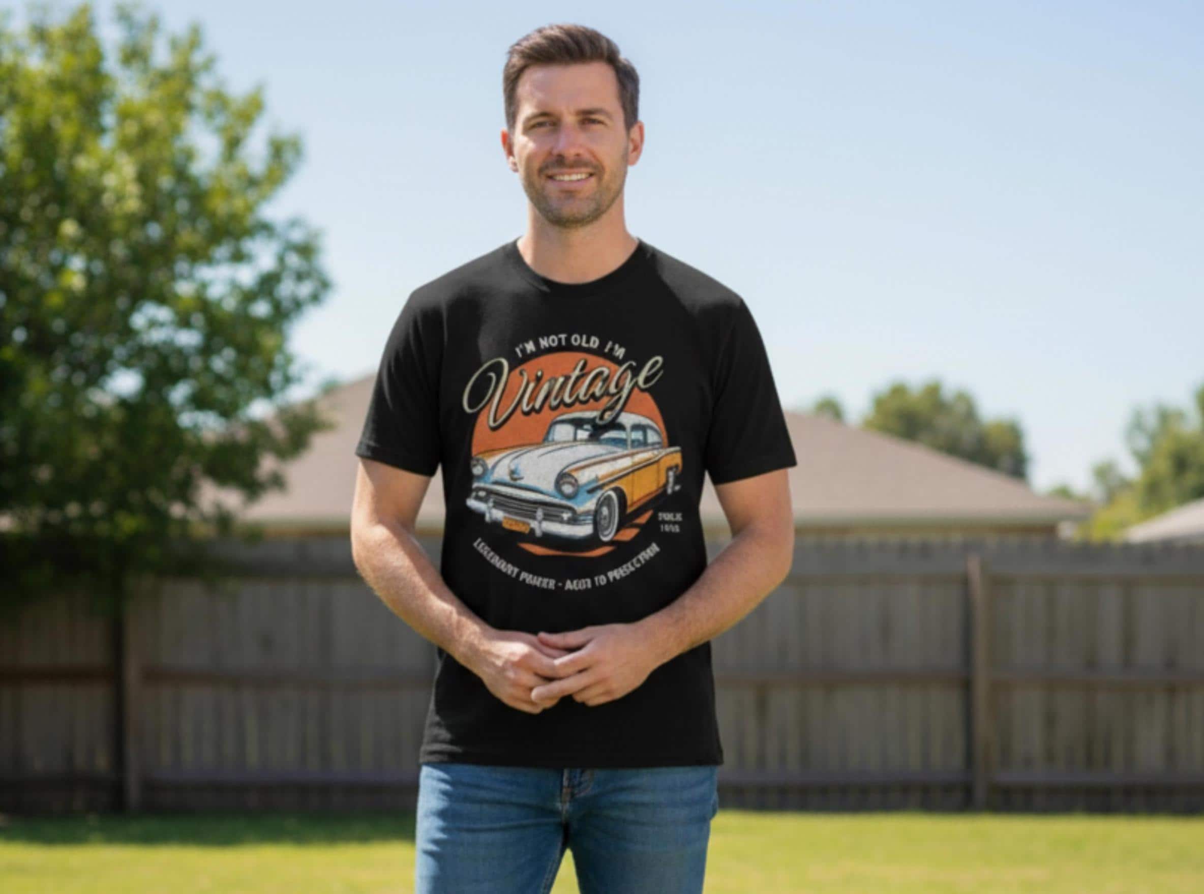 The retro graphic features a stunning 1950s-style sedan, set against a distressed orange sunburst, and includes the cheeky slogans: “I’M NOT OLD, I’M VINTAGE” and “LEGENDARY POWER – AGED TO PERFECTION.”