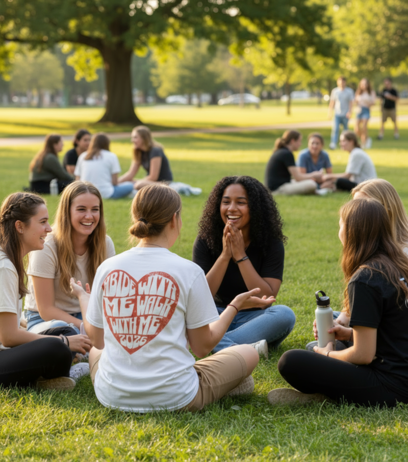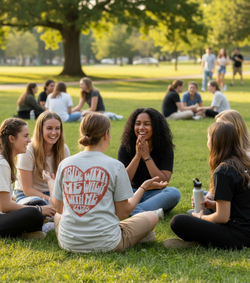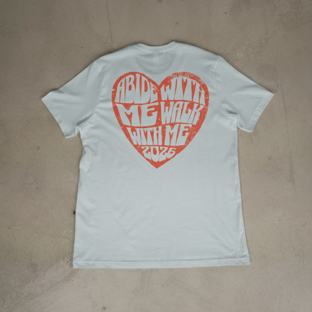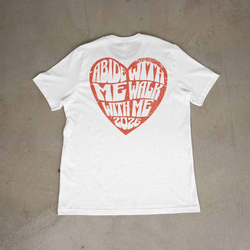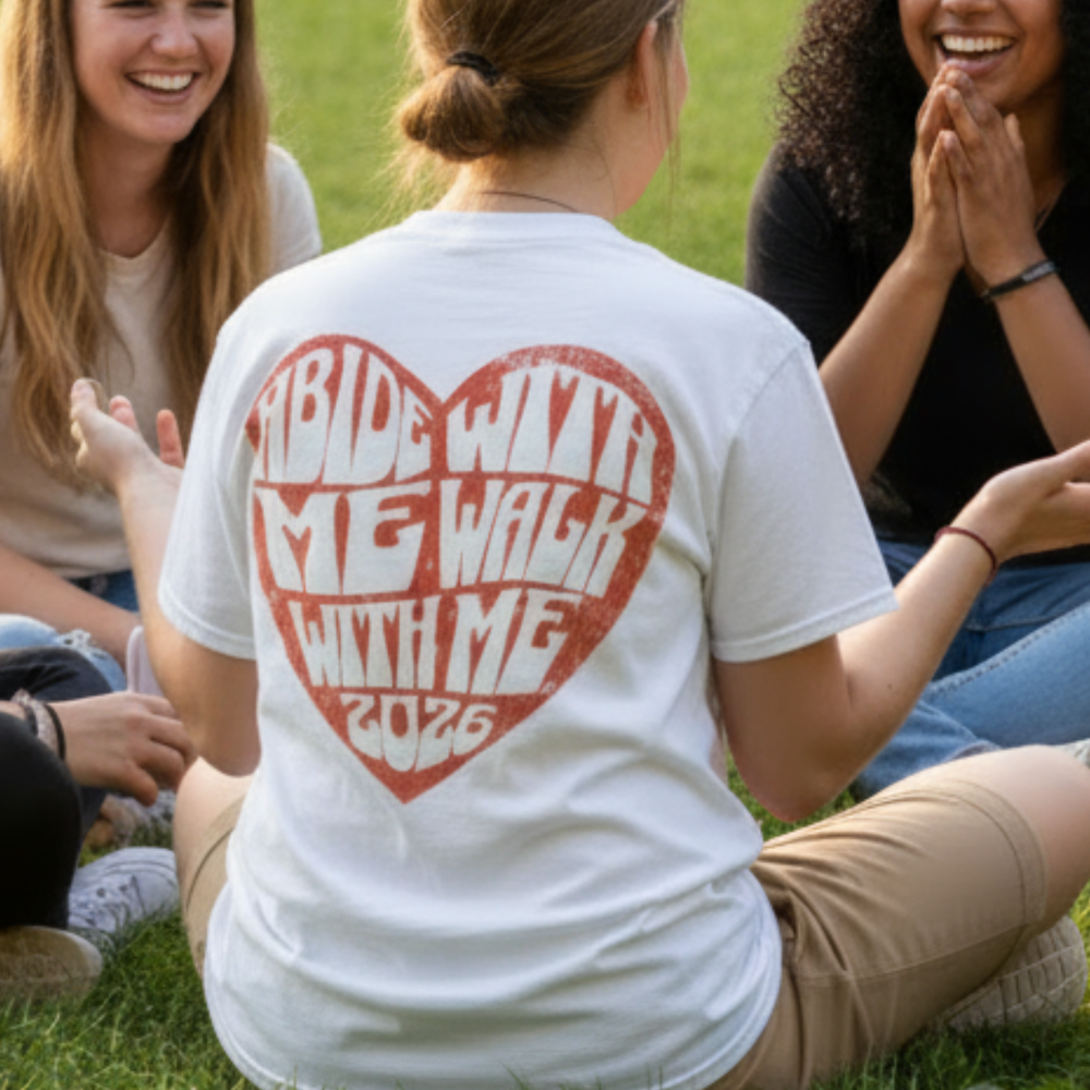 Embrace the 2026 Youth Theme with a design that is both meaningful and stylish. This comfortable, classic white tee features a vibrant, distressed red heart graphic that captures two powerful calls to discipleship: “Abide With Me” and the official 2026 theme, “Walk With Me.”